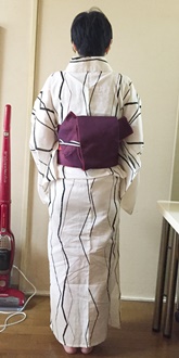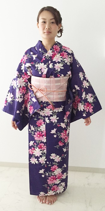 - 帯結びは控えめな「貝ノ口」。帯色はシックに濃紫を選ばれ、浴衣の色味にとても合っています。職種が似ていることから話がはずみとても楽しく着付けさせていただき、ありがとうございました。
